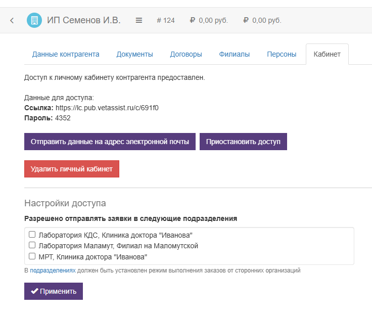 Если кабинет еще не создан - нажмите кнопку "Предоставить доступ". В результате будет создан новый личный кабинет для данного контрагента.